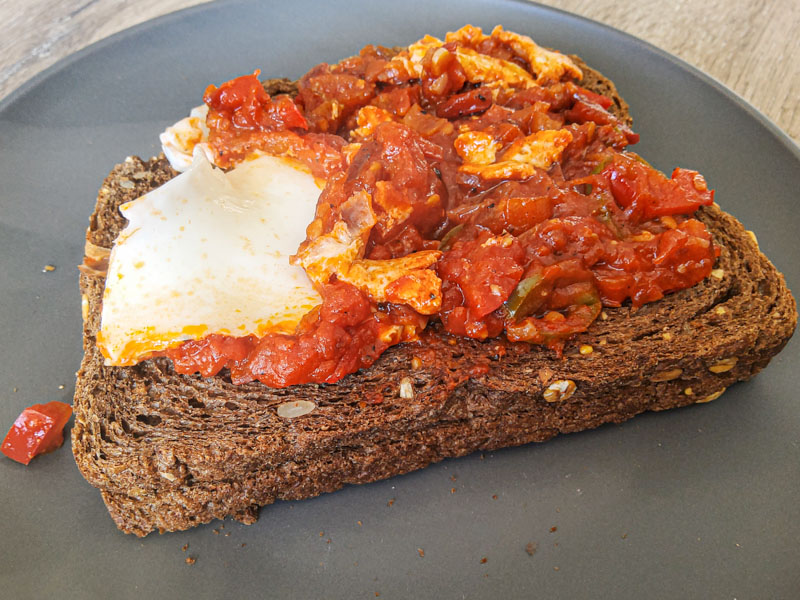 Weer eens een andere Lunch in elkaar gezet met een pittige bite. Shakshuka, met Tomaten en Ei gecombineerd op een donkerbruin geroosterd sneetje Brood