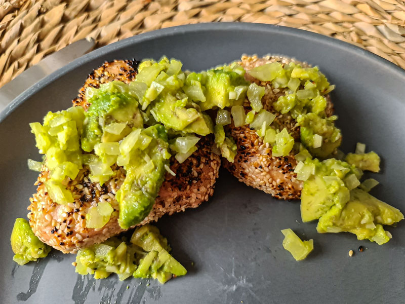 Een heerlijk zachte Tonijnsteak met Sesamzaadjes. De Avocado Guacamole geeft de Tonijnsteak een fris zuur smaakgevoel.