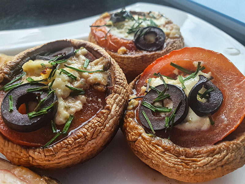 Dek de Champignon met vulling af met een schijfje Tomaat