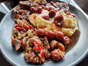 Als je dan Kalfssukade over hebt dan maak je er een heerlijke Curry van. Met witte Rijst een behoorlijk pittige hap