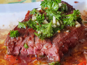 Een lekker stukje vlees met een frisse Salsa aangevuld met geroosterde Aardappelblokjes met Knoflook en Bieslook