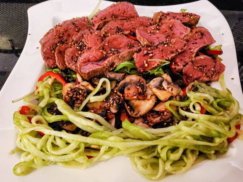 Snijd nu de Kogelbiefstuk in dunne plakjes en verdeel het over de Salade