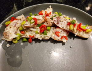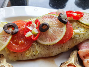 Benodigdheden:1 Pangafilet1 Tomaat1 Limoen1 Zwarte Olijf1 Bosui1/2 Madame Jeanette PeperOlijfolieSanta Maria Lime Pepper voor een heerlijk pittige limoensmaak Voorbereiding:Dep de Pangafilet droog met keukenpapierSnijd de